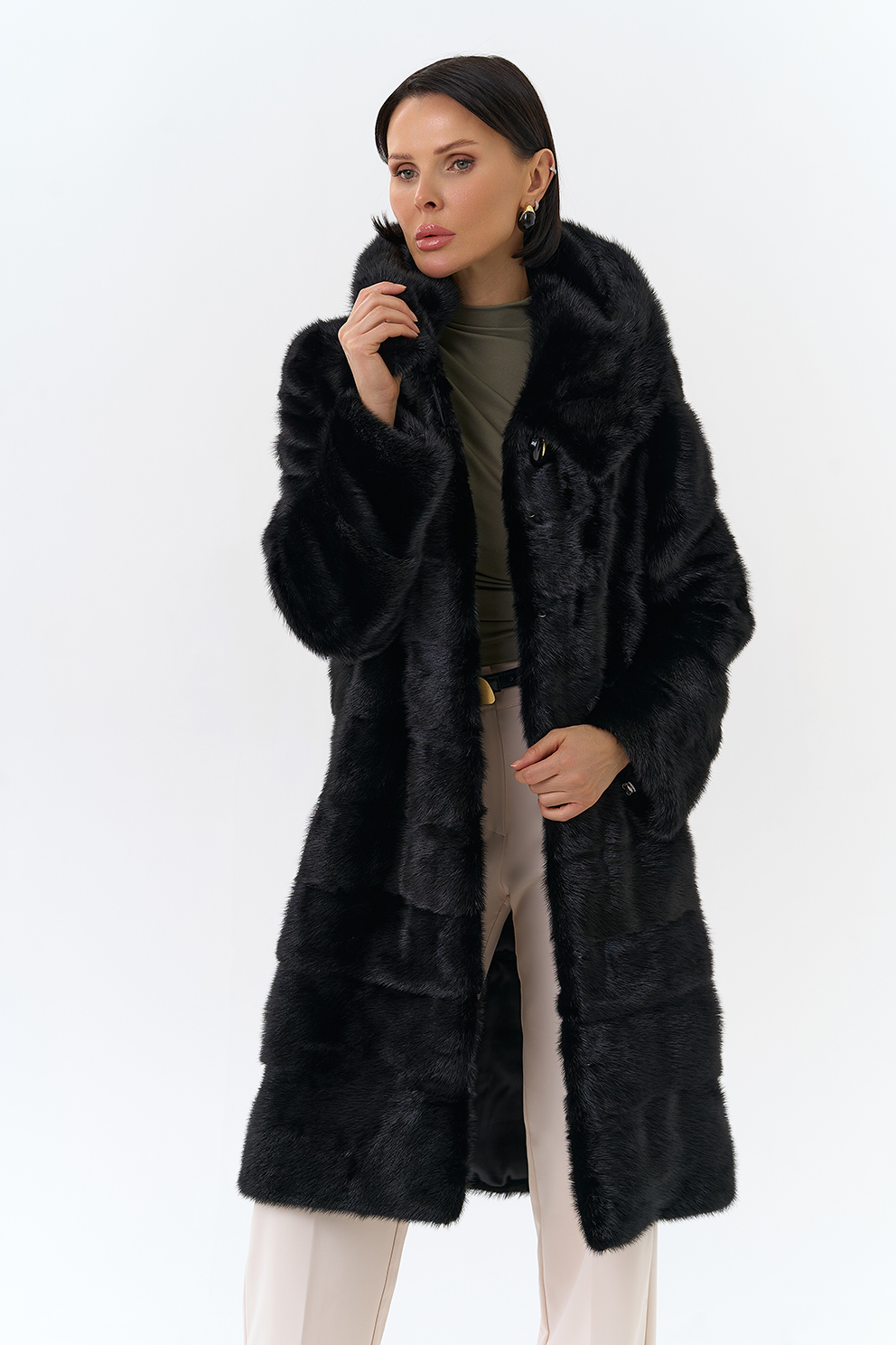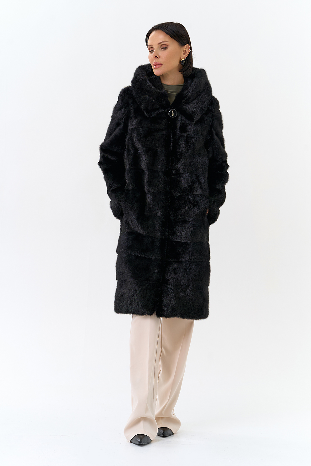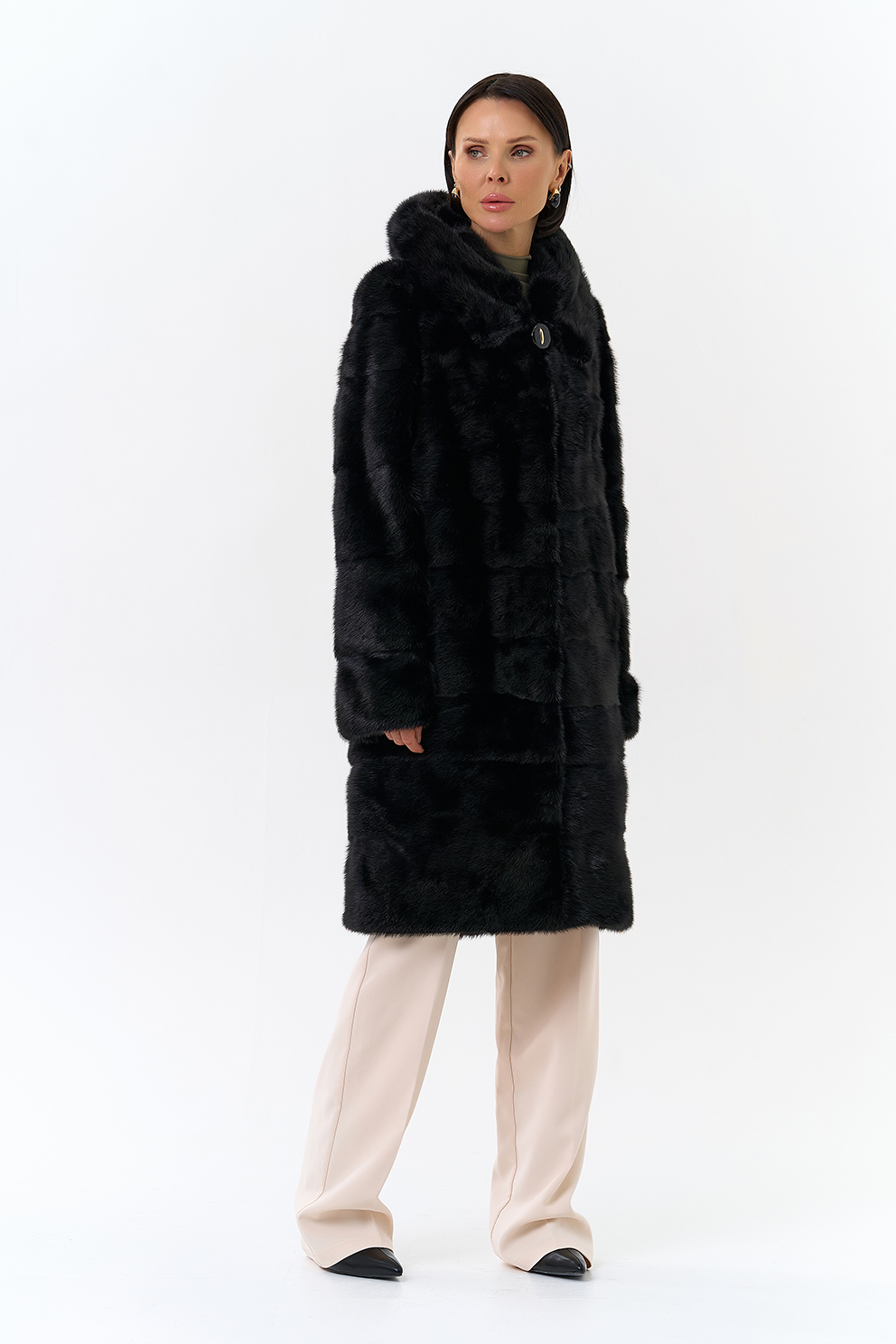 Шуба из меха норки черного цвета. Изделие средней длины, но его можно укоротить, как и рукава. Застегивается с помощью шубных крючков и пуговицы. Модель прямого фасона и дополнена объемным капюшоном. Раскладка меха - поперечные пластины. Подклад из полиэстера износоустойчив и позволяет носить шубу долгое время. Модель сочетается как с брюками, так и с юбками.